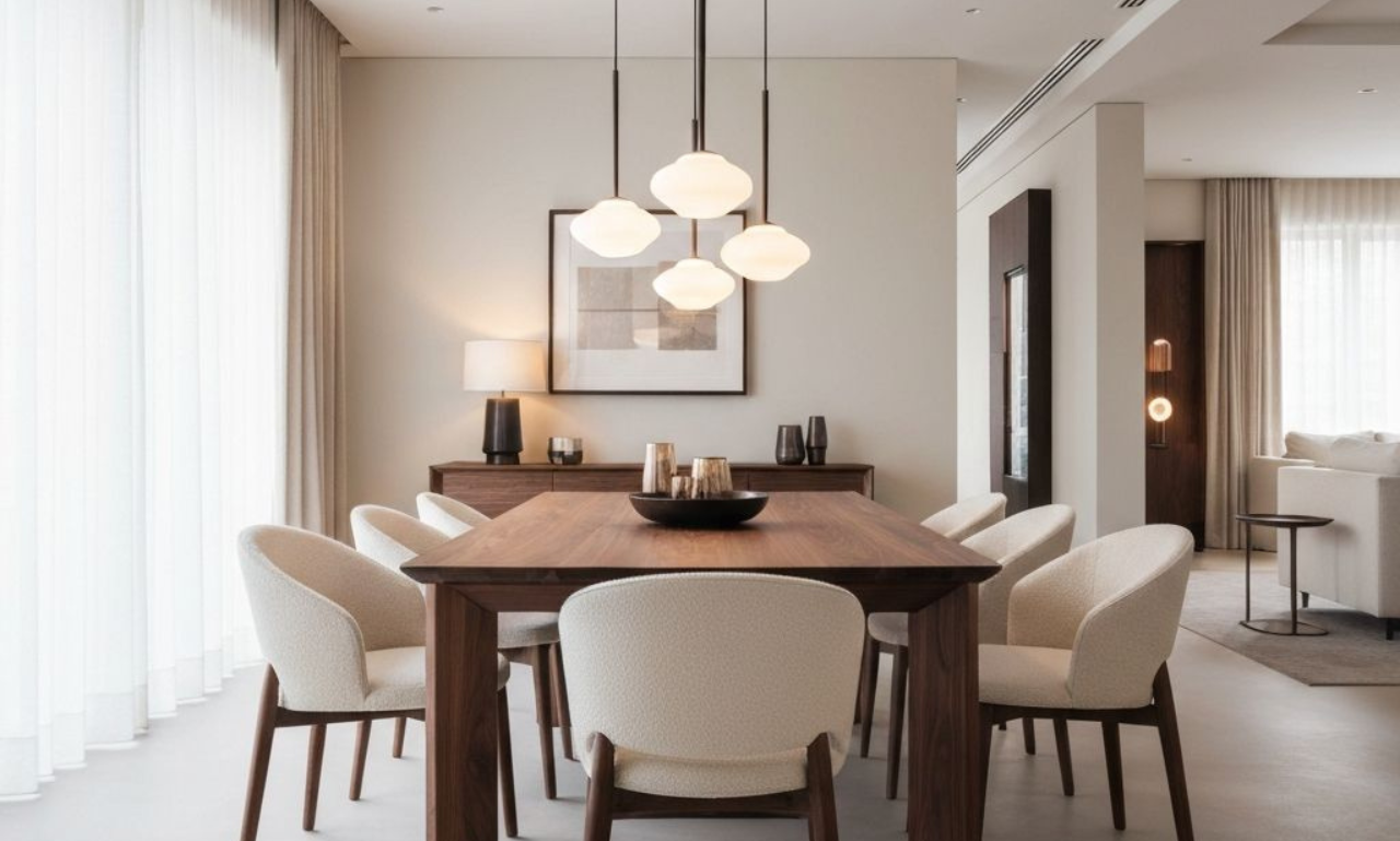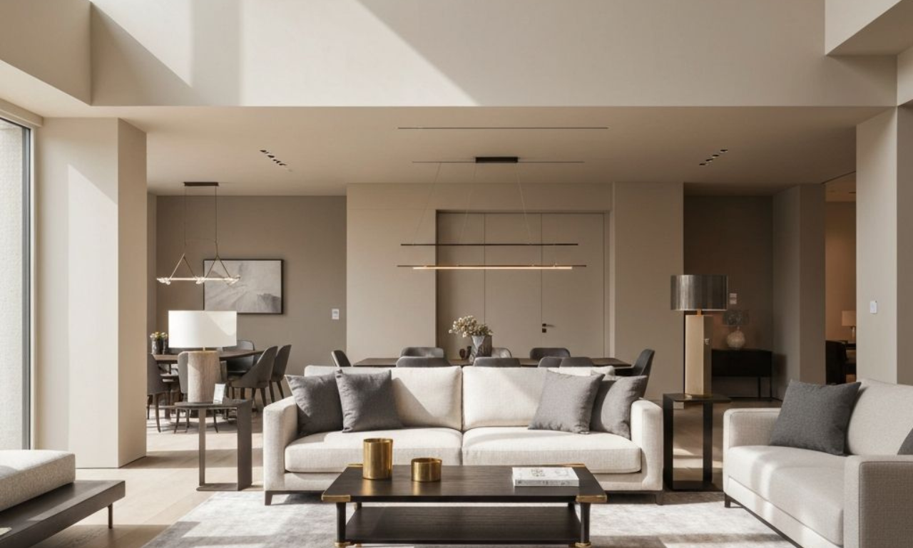 Die Materialauswahl orientiert sich an natuerlichen Texturen und warmen Farbtoennen, die eine einladende Atmosphaere schaffen. Jedes Moebelstueck wurde sorgfaeltig ausgewaehlt und auf den Raum abgestimmt.
